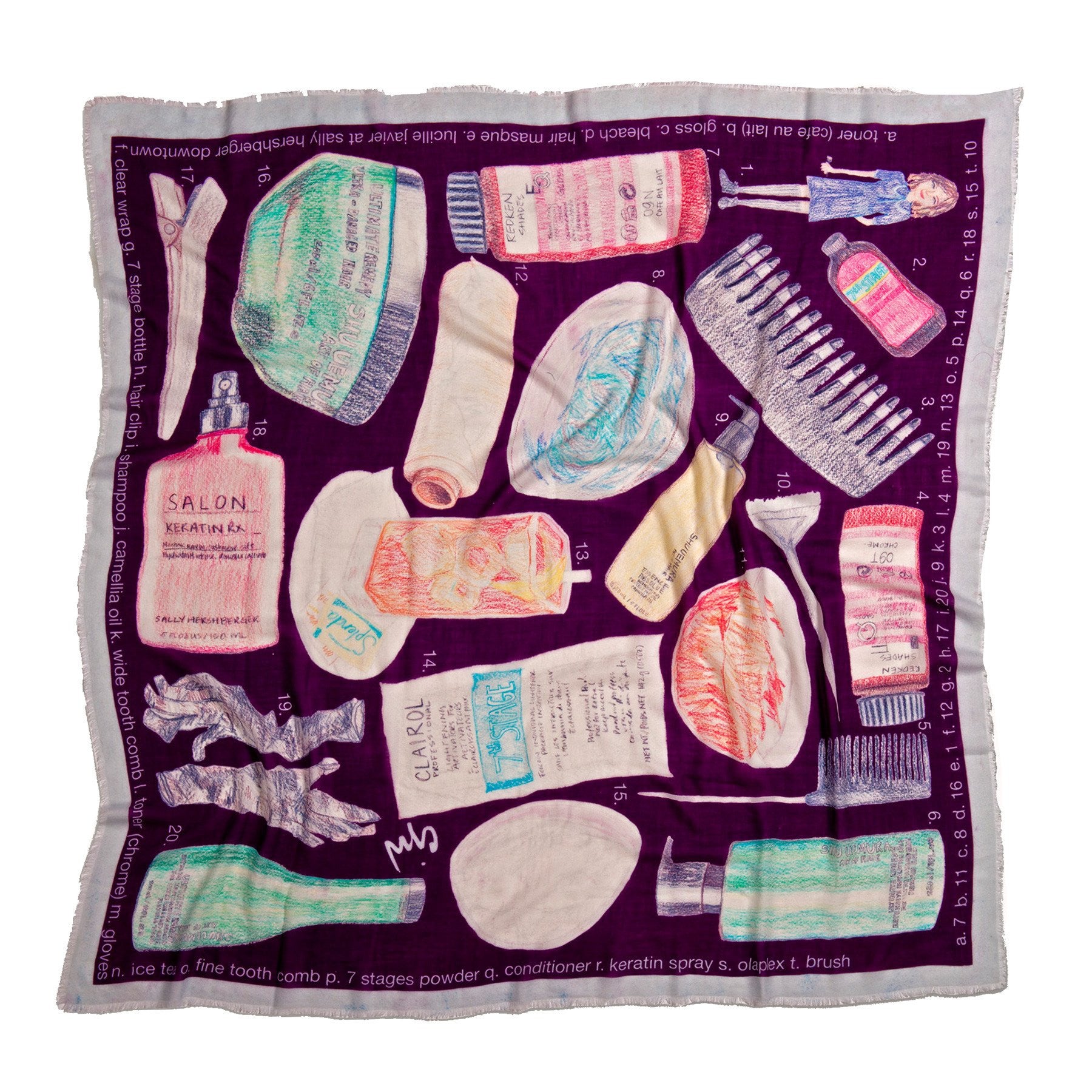 The Blonde Asian Scarf by CJW x #BeAwesomeToSomebody is part of the FW’15 collection. The piece features drawings of all the tools it takes to go platinum blonde, such as: Clairol 7th Stage bleach, Olaplex treatment, Shu Uemura color safe shampoo, mixing bowls, clear wrap, and of course Lucille herself.