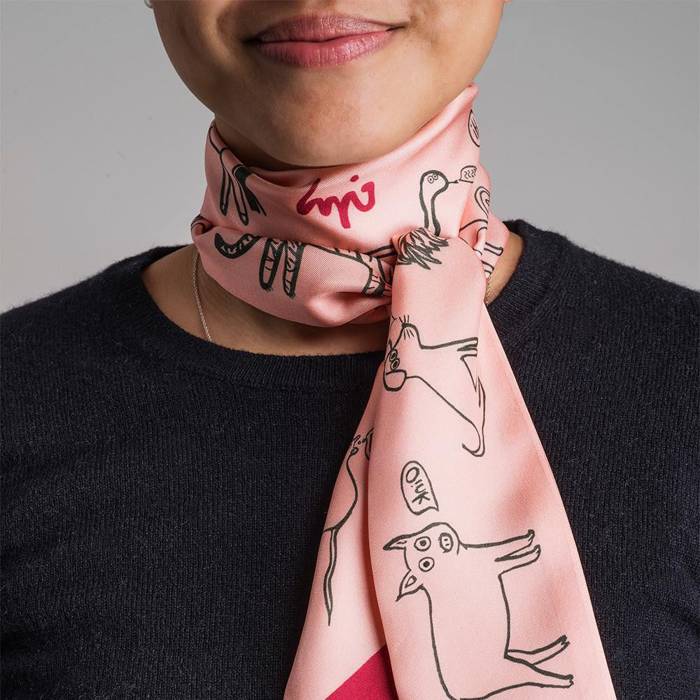 53x3" 100% Twill silk Twill silk scarf featuring the twelve cheeky Chinese zodiac animals honoring CJW's Chinese heritage.