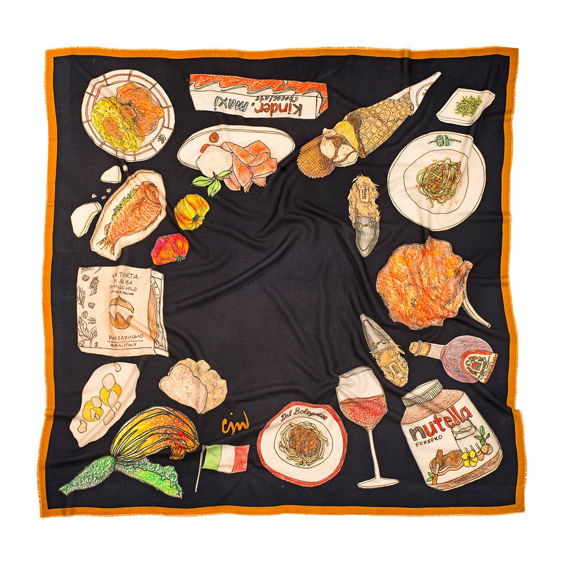 53x53" 100% Featherweight wool Square, all season featherweight wool scarf with frayed edges featuring CJW's favorites from her Italy travels: think Nutella, bolognese pasta, veal milanese and Gucci slides!