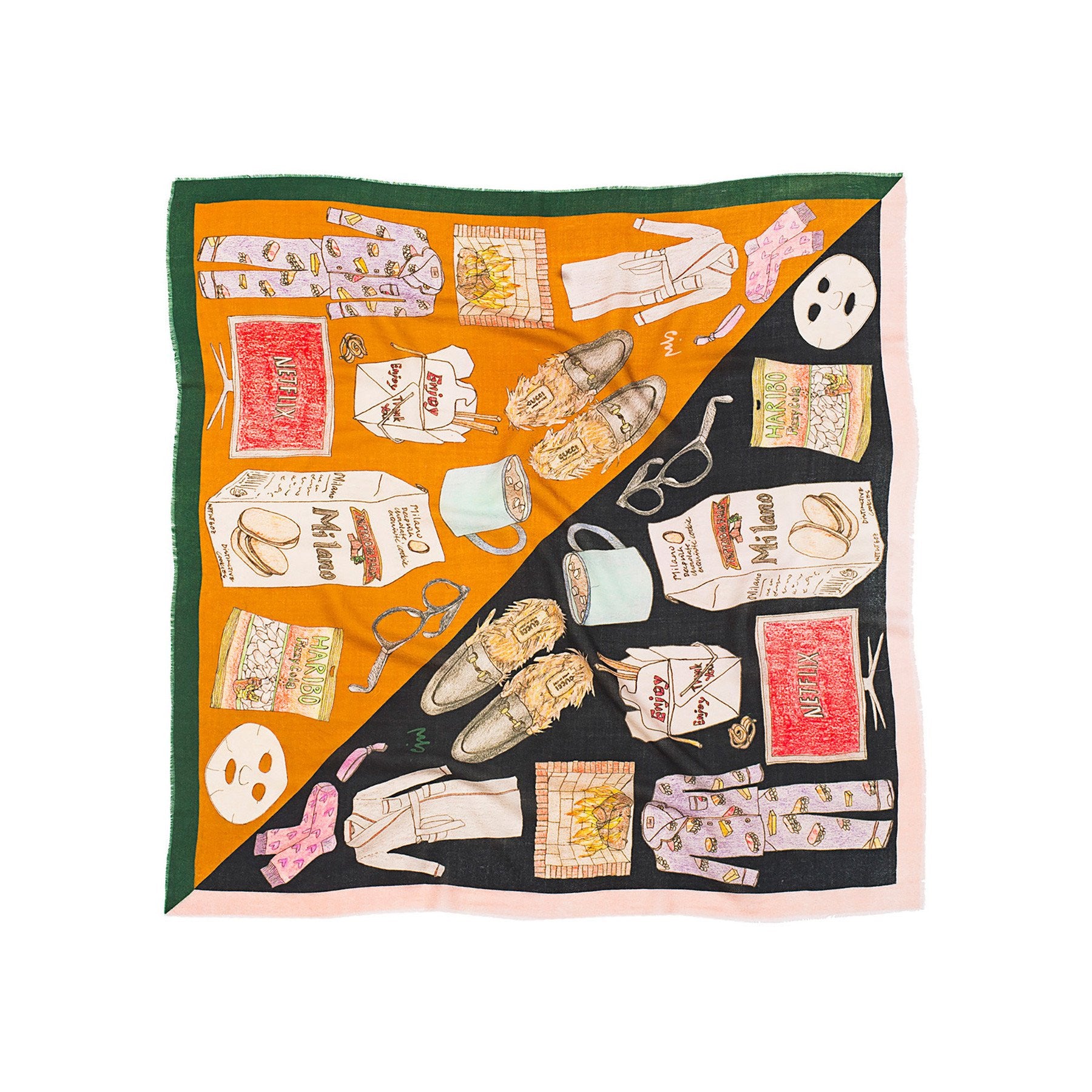 36x36" 100% Featherweight wool square, all season featherweight wool scarf with frayed edges featuring CJW's Netflix and chill essentials- a face mask, package of milano cookies and a fireplace makes any tv binge that much more satisfying.